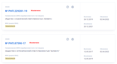Помимо сказанного ООО «ХЕЛМЕТС» уже дважды было в реестре недобросовестных поставщиков, что делает его репутацию еще более сомнительной.