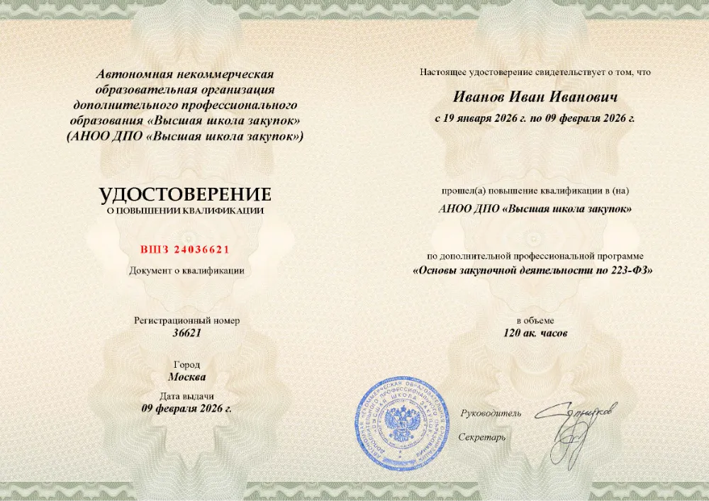 Вы получаете официальное удостоверение о повышении квалификации. Высшая школа закупок (fz44.org) в обязательном порядке вносит сведения об обучении в Майкопе в реестр ФИС ФРДО, подтверждая легитимность вашей подготовки перед контролерами.