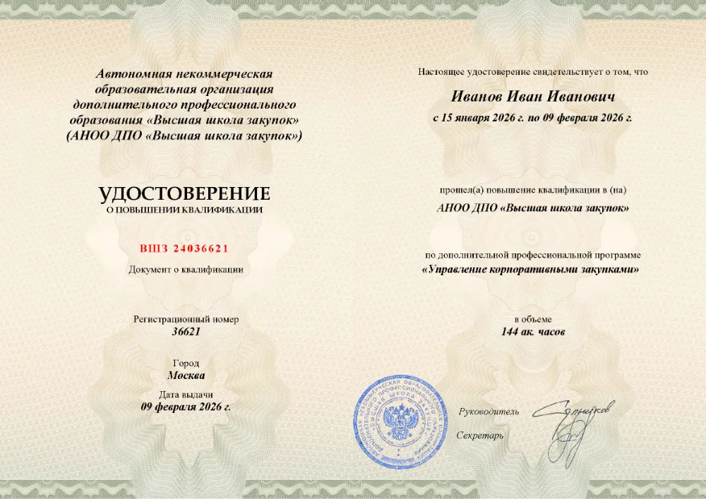 Вы получаете официальный документ о повышении квалификации. Высшая школа закупок (fz44.org) в обязательном порядке вносит сведения об обучении в Майкопе в реестр ФИС ФРДО, подтверждая легитимность вашей подготовки перед контролерами.